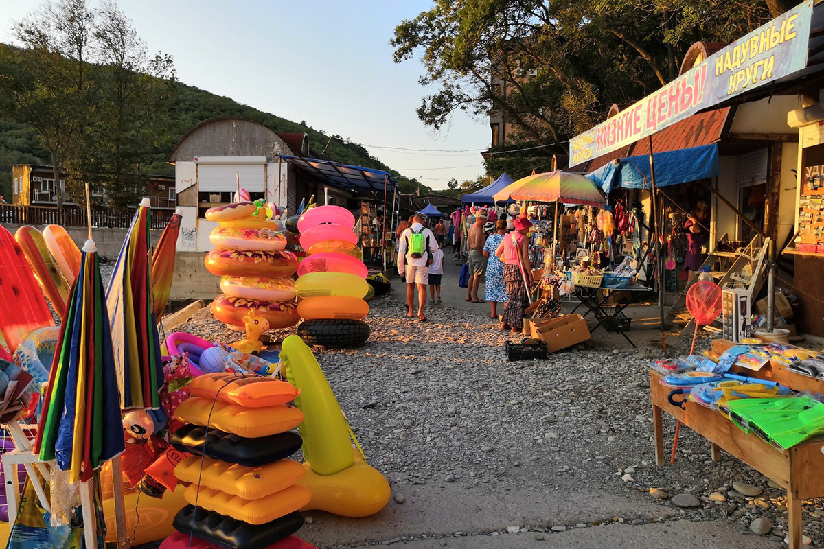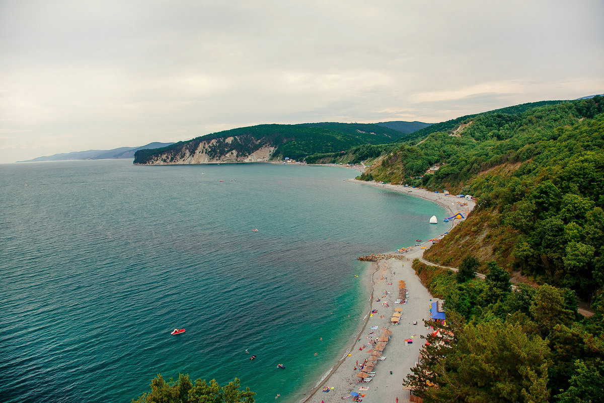 Оборудованный пляж имеет намного большую протяженность - от скалы вплоть до устья ручья Малый Бжид. Здесь Вы найдете точки проката пляжного оборудования, надувные водные аттракционы, сюда прямо к берегу причаливают прогулочные катера. Далее, за ручьем пляж продолжается до самого скалистого утёса, физически ограничивающего бухту.
