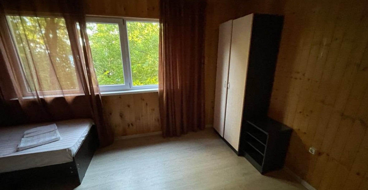 На втором этаже - две спальни: одна с двумя односпальными кроватями, вторая с тремя односпальными кроватями. Вторая комната проходная. Первая спальня оборудована шкафом для одежды. Окна из спален выходят в лес.